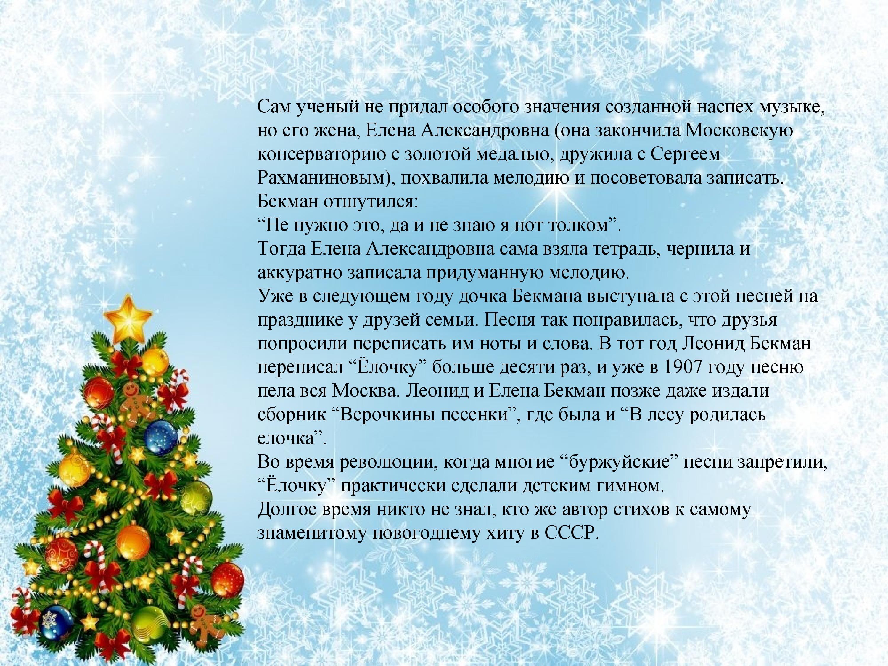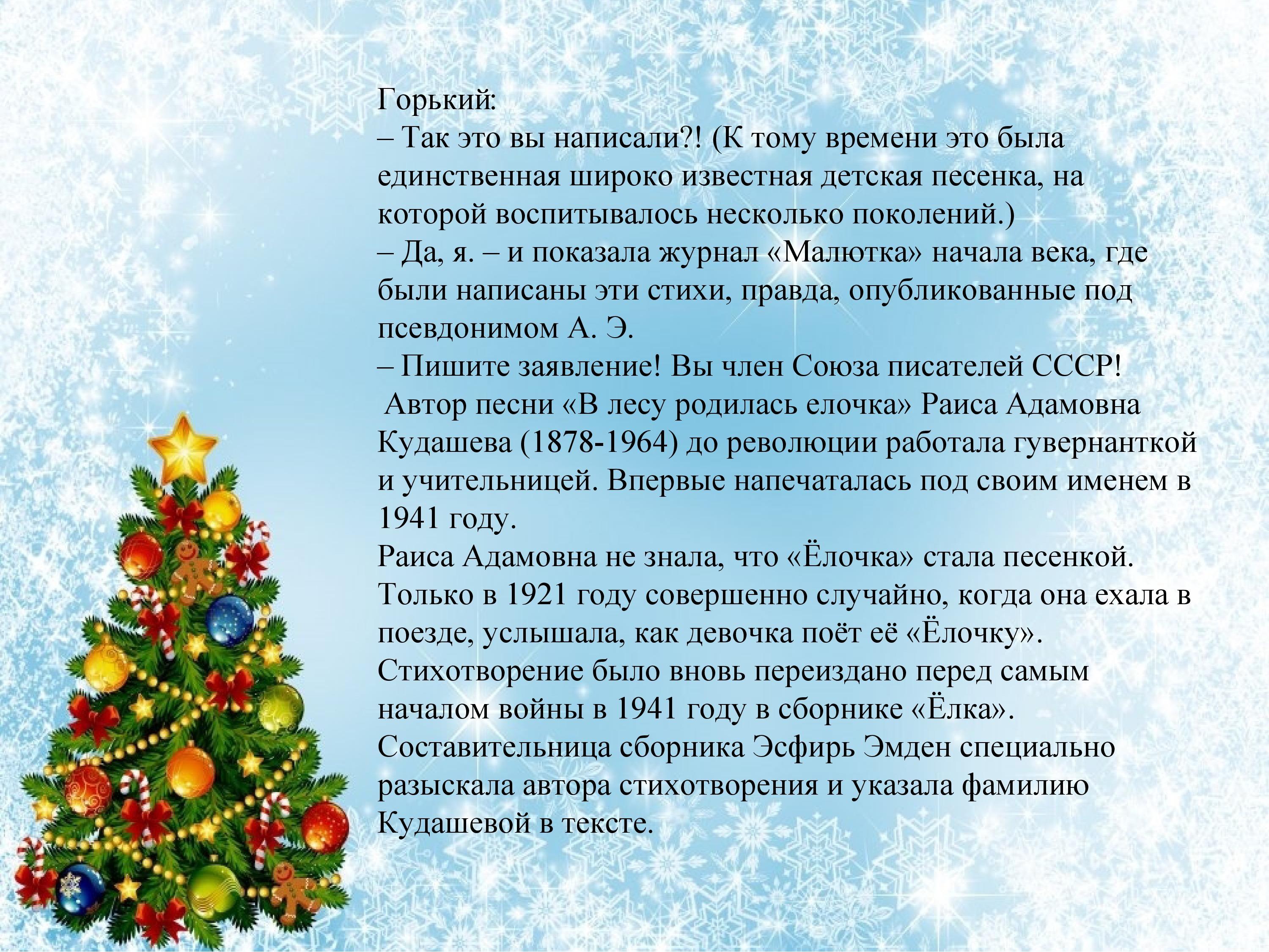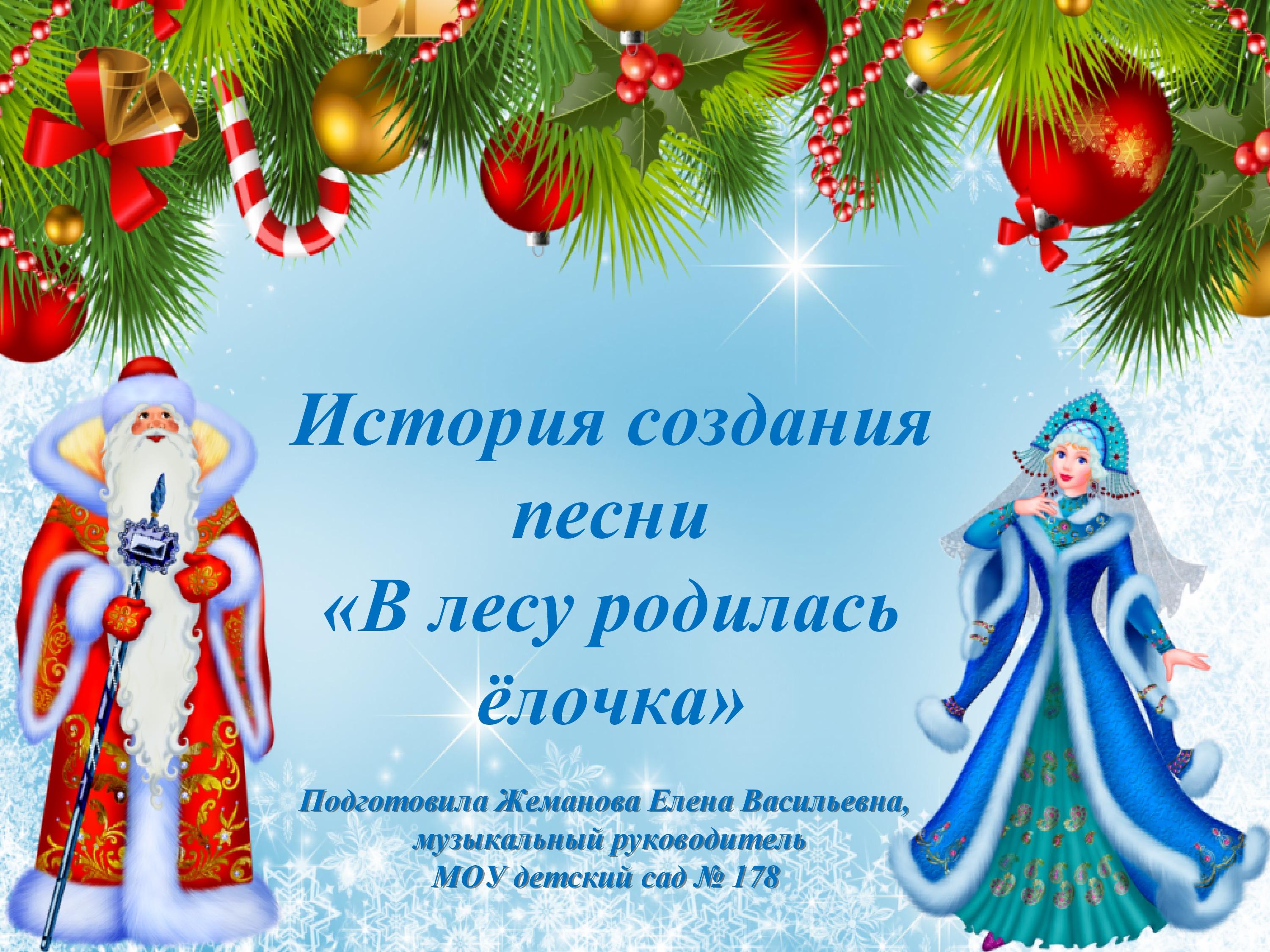 История песни "В лесу родилась ёлочка" Посмотреть вместе с детьми мультипликационную версию песни «В лесу родилась ёлочка» можно пройдя по ссылке https://ok.ru/video/6369887586972